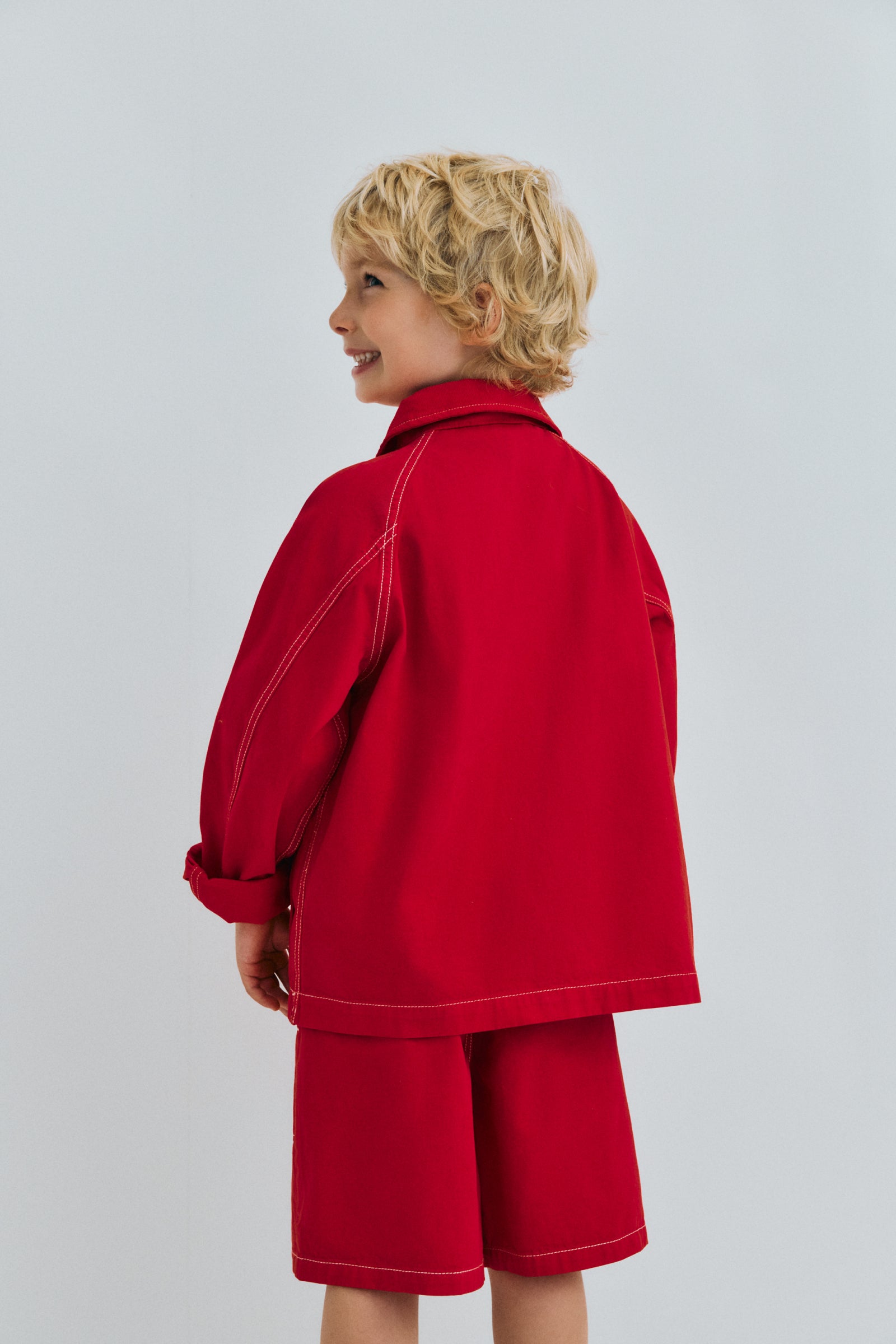 Cotton canvas bermuda shorts featuring stitched pocket details and an elastic waistband with a matching drawstring. The contrasting topstitching adds a unique, special touch to the piece.