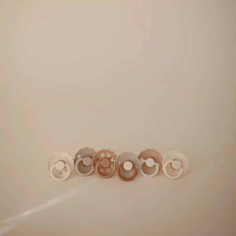 De FRIGG 6-Pack is een zorgvuldig samengestelde collectie van zes ronde fopspenen, waarin enkele van onze populairste designs en handgeselecteerde kleurcombinaties samenkomen in één elegante bundel.