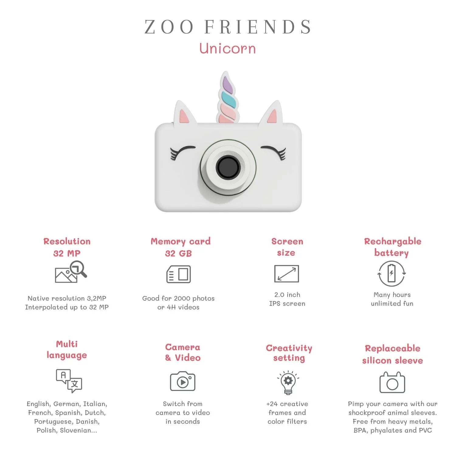 Maak kennis met onze leuke unicorn ontworpen 32 megapixel digitale kindercamera en videorecorder van The Zoofamily! Deze schattige camera is compact, lichtgewicht en perfect voor kleine handjes. Versier de camera van je kind met stickers en ontdek meer dan 20 camerafilters en kaders voor eindeloos creatief plezier.