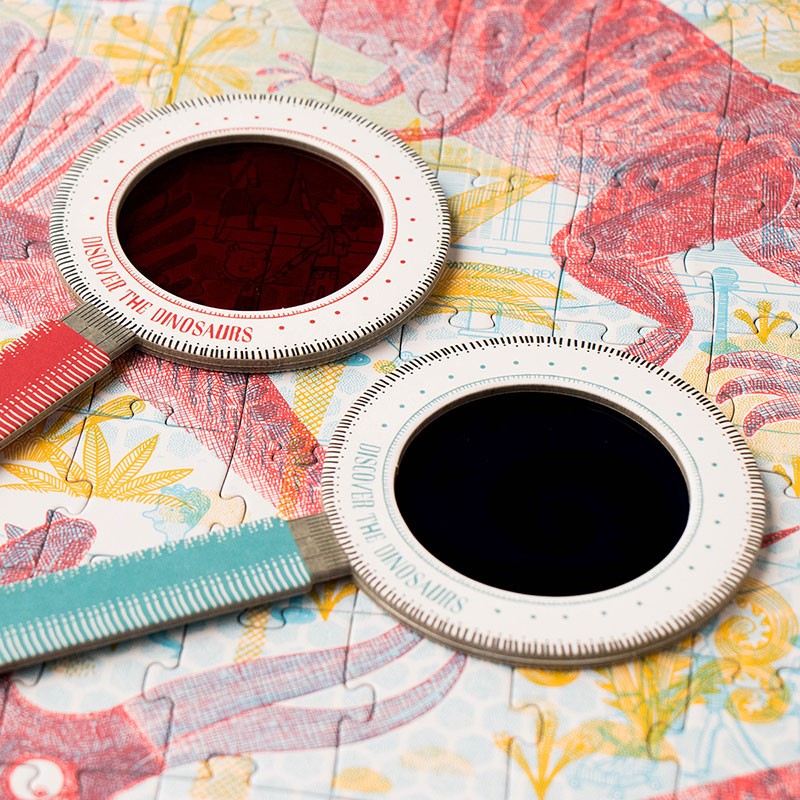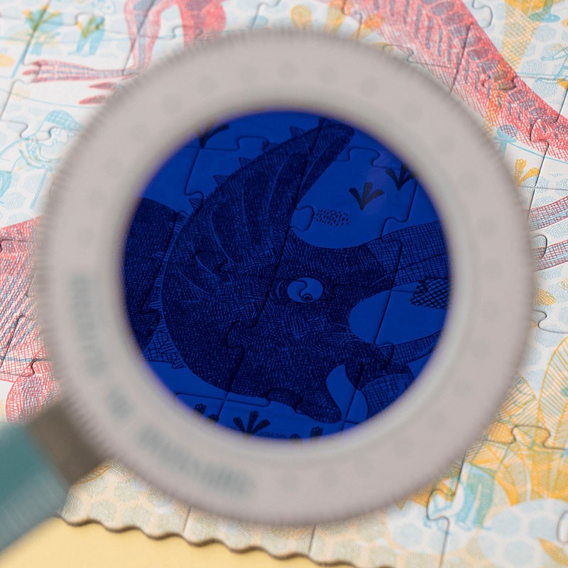 Een zeer originele puzzel, met een rood vergrootglas reis je naar de Jura-periode en met het blauwe vergrootglas ontdek je het museum.
